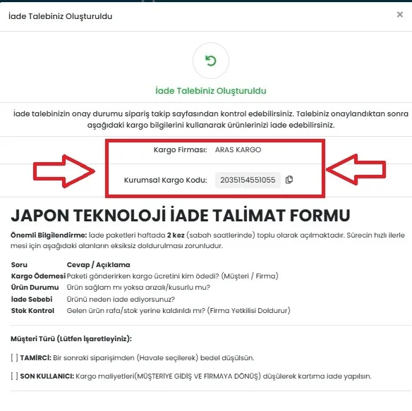 Önemli Not: İadenizi anlaşmalı ücret ile ücretsiz olarak göndermek(geri iadede düşülecektir) için sistemin size özel tanımladığı Aras Kargo kodunu kullanmanız yeterlidir.Örnek alttaki görseldeki gibi;